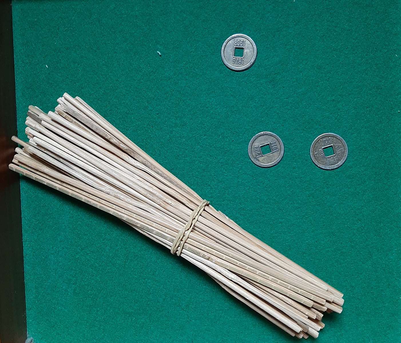 Tirage d’un Yi Jing (outil de divination de la tradition chinoise) : avec des baguettes d’achillée ou 3 pièces.